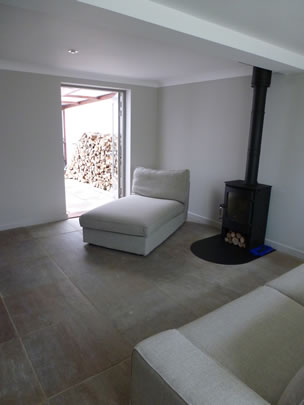 The kitchen was remodelled to accommodate family dining and a separate utility area; a steel multi-fuel woodburning stove was installed to heat the house up quickly when arriving on cold Friday evenings.