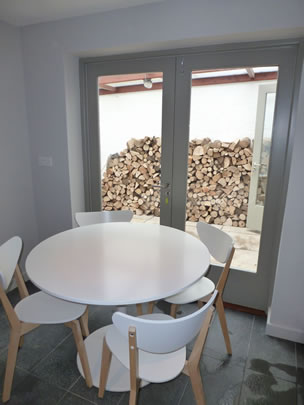 The kitchen was remodelled to accommodate family dining and a separate utility area; a steel multi-fuel woodburning stove was installed to heat the house up quickly when arriving on cold Friday evenings.